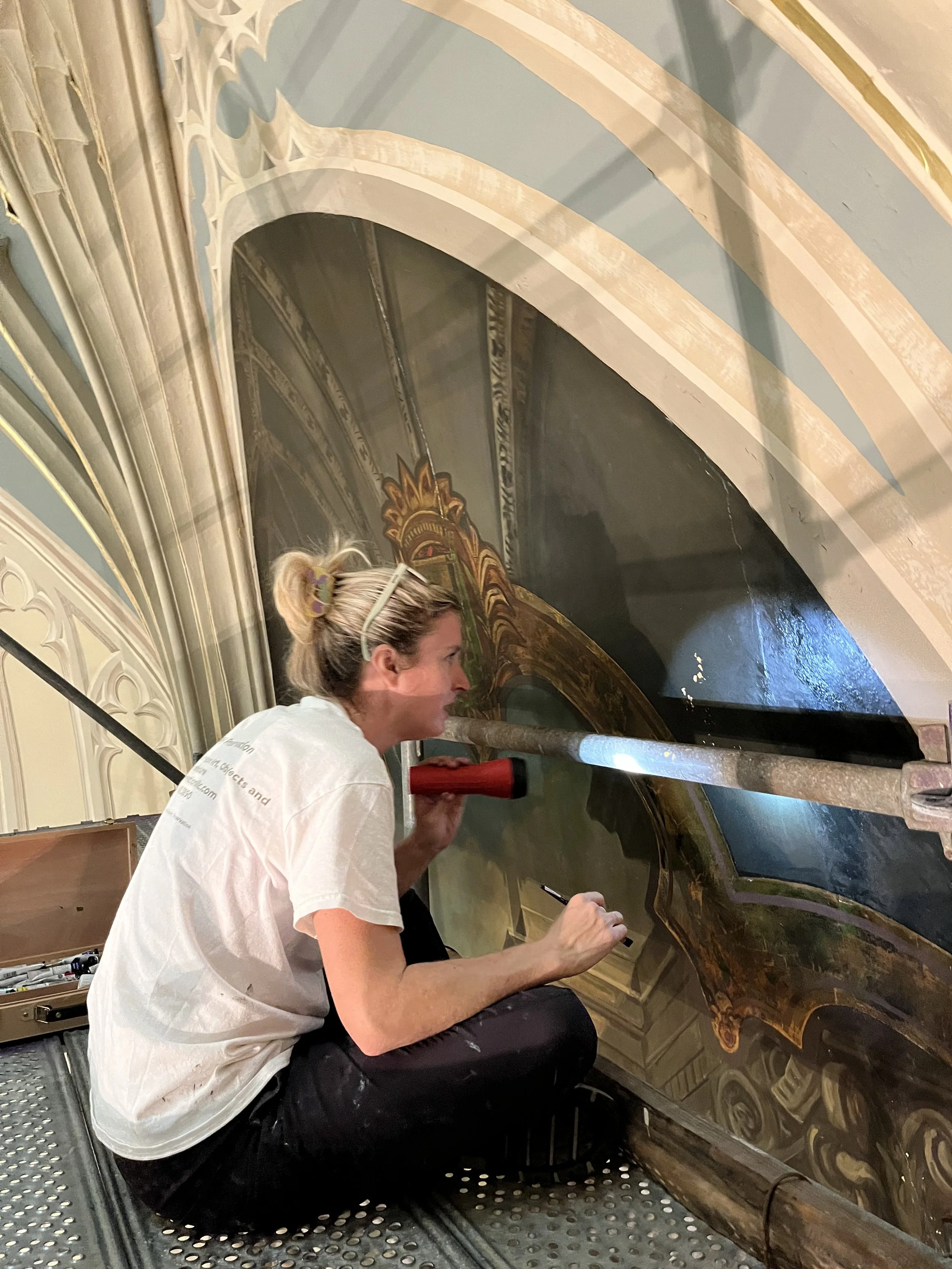 Juliette Hotard carefully cleaning the top of a fresco at St. Patrick’s Church in New Orleans
