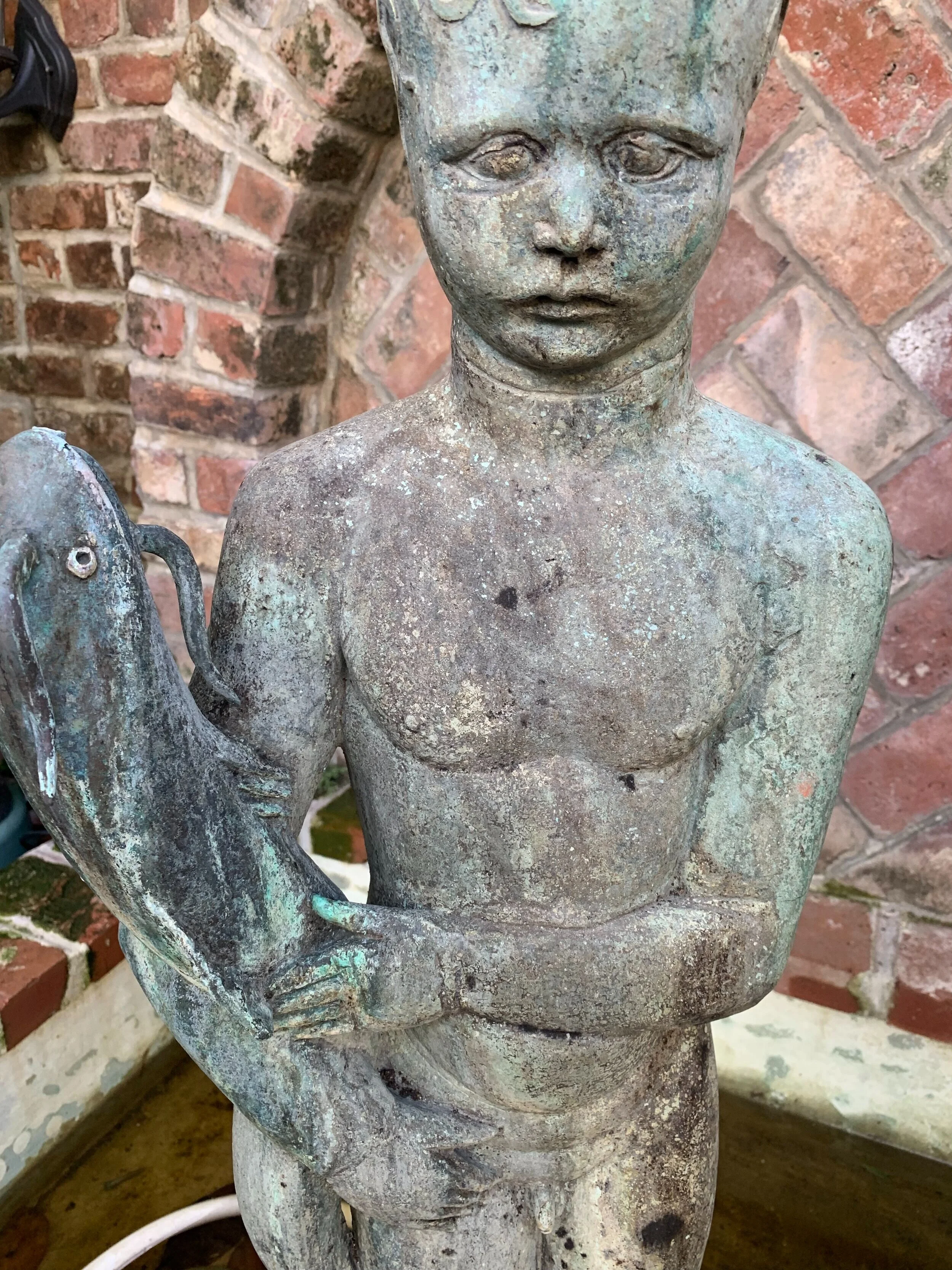 For "Boy With Catfish," we carefully cleaned the sculpture, reversed the verdigris on the body, increased the verdigris on the fish, and then waxed the sculpture.